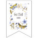 Denna buntingbanner visar en samling naturinspirerade dekaler fjärilar och blommor i en blå/guld stil plus bokstäver som visar frasen "Snart Bättre" med en typograf stil i detta Snart Bättre tema. Alla banners har ensidig utskrift utomhus säker och tillverkad med tjock plast rep har (16) 5.5" x 8" swallowtail flaggor på en 6' lång sträng.