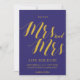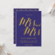 Ett chic rustikt "Spara datum" med "Mrs och Mrs" i ett skript-teckensnitt i guld på en koboltblå bakgrund.