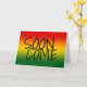 Berömden tre-tonade randfärgerna som är synonyma med jamaikansk kultur, skapar den perfekta bakgrunden för all-locken som jamaikanen formulerar, KOMMER SNART.