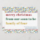 Gravid för färgstark och personlig helgdag. Denna moderna typografi har gräns i julklapp ljus i rött, blått, grönt och gult. Huvudtexten lyder "god jul från vår snart fyra" och du kan redigera "fyra" till det spelar ingen roll nummer du behöver. Du kan också lägga till förfallodatum för baby, anpassningsbar hälsning och namn. Modern, minimalistisk och glad.