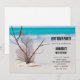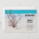 Födelsedagsinbjudan med en vacker fotografering. Tropiskt blått vatten och skummande vågor i bakgrunden. En samling sniglar och stjälkar på en vit sandstrand.