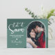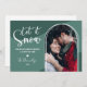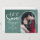 Elegant-grönt-christmas-kort med ditt foto i form av en snö-glob, med en vinningseffekt i snö, det festliga ordspråket "låt det snöa", säsonhälsningar, ditt namn och året.