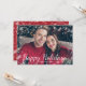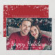 Det här festliga julkortet har en ramöverlagring med vita snöflingor och ett elegant skrivsätt för anpassning. Baksidan har samma konstverk med röd bakgrund och text för ditt meddelande.