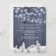 Chic elegant Rustic vinterfest för utskrivbar möhippa med snöflingor, gräs träd-skog och berg, stringor eller tinkle-ljus på en marin blå ladugårdbakgrund. ++++++++++ Inbjudan är lämplig för en elegant land vintertid eller helgdagar brudens sida. ++++++ Digital nedladdning finns tillgänglig.