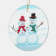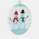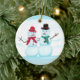 Lägg till lite jultjusning i Julgran med det här paret lycklig snö med hatt och sjalar och som viftar med hatten, som är tryckt på hängda keramiska prydnadsföremål. Du kan också anpassa med text.