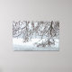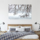 Bilden fångar en serenvinter-scen med snö-täckt ekar träd grenar i förgrunden. Grenar, nära snö, sträcker sig in i ram, vissa bär fortfarande brunt löv. Ett fält i snö sträcker ut sig i bakgrunden, med en linje av träd synlig i avstånd. Hela paletten i färg domineras av vita och gråa, som skapar ett kall och en fredlig atmosfär.