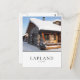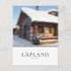 Fotovykortet av ett traditionellt snö-täckt trä loggar kabinen i Lapland i norden av Finland ovanför norra polcirkeln med en vit boxas med texten "Lapland, Finland".