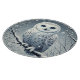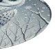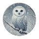 Vackra snö uggla, med iögonenfallande blå ögon, genomträngde på en frostig gren i träd under snöfallet. Den här fantastiska bilden fångar naturens skönhet under kallets årstider, och väcker stolthet och vintern.