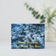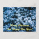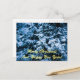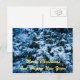 Snöfall i skogen. Snöflingor i luften. Julgran täckt av snö. Blå och gröna färger, vinterstämning. Du kan ändra eller ta bort malltexten God Jul och Gott Nytt År!
