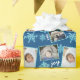 Modern möter vintage med denna klassiska blå julomslutning papper med en upprepad mönster av dina tre foton och faux blue opal iridescent snöflingor. Tre textmallar i vitt typsnitt kan redigeras för din anpassningsbar presentfigursättning - utrymme för ditt namn, året och ord Joy. Varje foto som du överför ramas in av ett simulerat blått ram som matchar snyggten snöflingor med ett irdescent-tecken. Skapa din egen helgdag presentfigursättning - lägg bara till dina foton - som koordinerar med samlingen Snowflake Blue Opal som endast är tillgänglig i min butik.