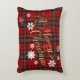 Den dekorativa julen dekorativ kudde har en röd, svart, vit och guld plaid eller tartan-bakgrund mönster med ett vitt snöflingor mönster som är utspridt överst. Det finns också simulerade guld-bokstäver som säger "A God jul" i ett teckensnitt av vintage.