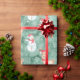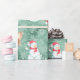 Papper för julomslagning har en snöflingad bakgrund i grönten och är täckt med glada snögubbar och de finaste renarna!