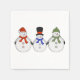 Tre söta snögubbar med halsdukar och var och en med speciella dekorerade kläder. En julhatt, en beanie och en top hat.