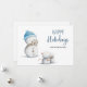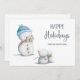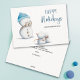 Blått kort med en illustration av ett snögubbe som tar bilder. Illustrerad och designad av Patricia Alvarez.