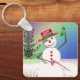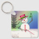 Nyckelkedja med min 3d-teckning av en leende mistletoe och candy cane och med en röd hatt som säger "God jul".