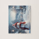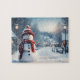 Snögubbe i byn. Vinterscenen. Pussel