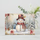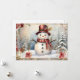 Ett leende snögubbe i en röd hatt och scarf omges av träd och blommor som täcks av snö på detta söta och charmerande platta julkort.