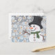 Gladlynt snögubbe i en snowstorm av daisy och snöflingor. Snögubben är le, och vinka, knäppas morotnäsan, kol ögon, och leendet, den gröna scarfen och bruntet knäppas. Blått-grått himmel. Original- konstverk med akryl målar.