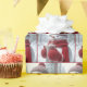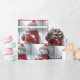 En glad snögubbe klädd i en röd hatt, scarf och mittenhätta håller en ångande mugg av hett choklad som är full av marshmallow