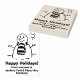 Rubber frimärke skriver ut ditt julmeddelande. Julgummi frimärke. Lycklig Snögubbe i solskenet. Lägg till din personliga hälsning.