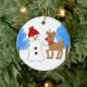 En söt snögubbe med lite rödnäsa renar i en skog av frostiskt träd.