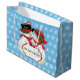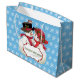Denna förtjusande utformning har en vintage stil, snögubbe och snö som bär röda sjalar och helgdag. Bakgrunden är en ljusblå söt med en vit snöflinga mönster. Den röda och vita plaketten vid grund lyder: "VÅR FÖRSTA CHRISTMAS". Denna text kan vara personlig med namn och speciella data eller ert eget helgdag-budskap. Mjölksäckar finns i stora, medelstora och små förpackningar.