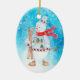 På framsidan av detta prydnadsämne finns en vattenfärgsbild av ett sött snögubbe som är klädd i en vintersötare, hatt och scarf. Han håller sina skidor och skidpoler och placeras på en söt abstrakt blå stjärna. Baksidan av dekorationen har samma blå och vita baksida med flera fält för att du ska kunna anpassa texten. *Design kredit till EphrazyDesign.
