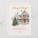 Ge dina hälsningar magin av högtiden med detta charmiga julkort som visar ett mysigt rött hus dekorerat med kransar, slingor och ett vackert upplyst träd täckt av snö.