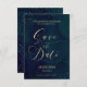 En kalligrafi "spara datum" har en mörkblå akvarellbakgrund med texten i guld.
