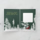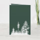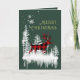 Ett julkort med en skogsgrön bakgrund med en vit silhuett av en tallskog, med dess reflektion i vattnet och en stor hjorthane som springer genom landskapet och en glad Glad Jul i en ljusare grön färg. Grafiken på detta kort sveper runt på alla sidor av kortet, vilket gör det ganska lyxigt för presentgivning.