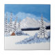 En keramisk platta med en vacker vinterscen med snöiga berg, rustik stuga och snötäckta barrträd. Bilden och texten kan anpassas. Originalkonst av W.B.