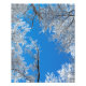 Ett snöigt vinterscen sett upp genom träden som är täckta med snö mot en klar blå himmel.