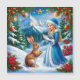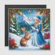 Idyllisk semesterstämning med en Snöjunga i en festlig klänning som interagerar med en vit kanin bland snö och grönskande dekorationer, mot en bakgrund av snötäckta berg.