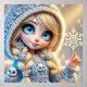 Charmfull snöprinsessa prydd i intrikat blå klänning mot en magisk, snöig bakgrund.