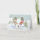 Två snömän försedda med mössor, rockar och halsdukar hälsar en liten rödhake på en snöig promenad genom skogen. Redigerbar text på framsidan lyder "God Jul". Perfekt för julen.
