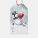 Snömannen visar kärlek med en stor hjärtat present presentetikett