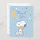 Skicka ett hjärtligt tack till dina gäster och de som gett presenter med detta söta Peanuts Snoopy och Woodstock tackkort. Framsidan visar den rörande illustrationen av Snoopy som kramar Woodstock under en ljus halvmåne och tindrande stjärnor, allt mot en lugnande ljusblå bakgrund med en text som lyder "Tack". Baksidan av kortet är helt anpassat och innehåller ett speciellt meddelande om barnets ankomst och föräldrarnas namn, vilket ger ett charmerande, nostalgiskt och personligt sätt att uttrycka din uppskattning efter din könsneutrala eller pojk-baby shower.
