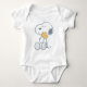 This is an adorable, short-sleeved baby bodysuit. The front features a charming, sketch-style illustration of Snoopy, sitting and looking happy while holding his paws near his face. The simple, classic Peanuts artwork is centered on the chest, giving the garment a sweet, nostalgic look perfect for a newborn or infant. This simple and high-quality design is ideal for everyday wear and a wonderful gift for any fan of the beloved beagle.