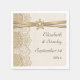 Elegant vit snöre, band och blomma på bröllop-papper napkin med blommigt vit snöre på naturlig kolv eller hessisk med två korsade satin-band och blomma i beige med metallskina och en vit juvel. Text i brunt. Observera att snöre, pärlhöns, blommor och juvel är "tryckta på" och inte äkta tyg, goster eller kristaller. Denna elegant, sofistikerad och romantisk utformning med ett rustiskt essens, ingår i en uppsättning bröllop och är perfekt för en chic i land eller westerna vår, sommar eller fall/höst bröllop, möhippa, mottagning, förlovning eller årsdag party med en neutralt färg palett.
