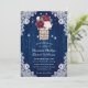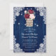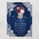 Rustic blommigts bröllopsinbjudan med en bukett av burgundy och ro och baby andedräkt i en rustik mason burk mot en lingbakgrund som är försedd med vit blommigt snöre och sträng ljus. Utformning av perfekt för att bjuda in gästerna till din marinblå, burgundära och , roliga bröllopsfest.