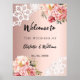 Välkomna till en elegant, romantisk bröllop. En chic ro guld-bakgrund. Dekorerad med rosa blommor, ro och vit snöre. Anpassa och lägg till namn från bruden och brudgummen och ett datum.