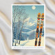 Hej från de snöiga bergen i Snowshoe, West Virginia, USA! Vi hoppas att du har en underbar skidsemester. Detta vykort visar ett vackert blågrått bergslandskap med retro-skidor i ett orange, tribal-mönster.