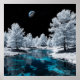 Idyllisk snöig skog vid en lugn blå sjö, med träd som speglas i vattnet under en levande stjärnhimmel dominerad av en utsikt över jorden. En lugn och overklig scen.