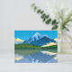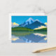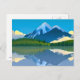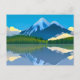 Postkort i en digital målning av snötäckta berg och tallskog, reflekterade i en sjö, under en djupblå himmel
