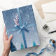 Elegantens julomslag papprare i blå, vita, gröntar av en vacker scen av en vintersnöppanoramisk syn med gräs träd.