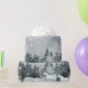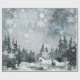 Kraft-färgad som är papper med stort och litet snöflingor mot en vattenfärg målad snöskog nattetid i himmel med två vackra vita hästar som skapar sig genom skogen.