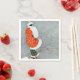 Art Deco vintage illustration of a woman wearing a red fur lined winter coat and hat, standing in the blowing snow with a cluster of snow buntings flying in front of her. Magazine cover illustration by Will Hammell (1914).