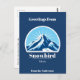Det här vackra vykortet med en logotyp från Snowbird Utah har ett vackert blått berg med solig bakgrund. Det är perfektens gåva till turister på en skidsemester! Du kan också anpassa den med ditt namn och med ett personligt hälsning.