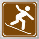 Vägskylt och skylt över motorvägar i internationell som ger råd om fritidsanläggningar, närmare bestämt: snöbordning.