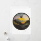 A sticker with an eagle flying over a mountain, in the style of contemporary landscape, golden light, black mountain college, fisheye lens, arts and crafts movement, mid-century illustration